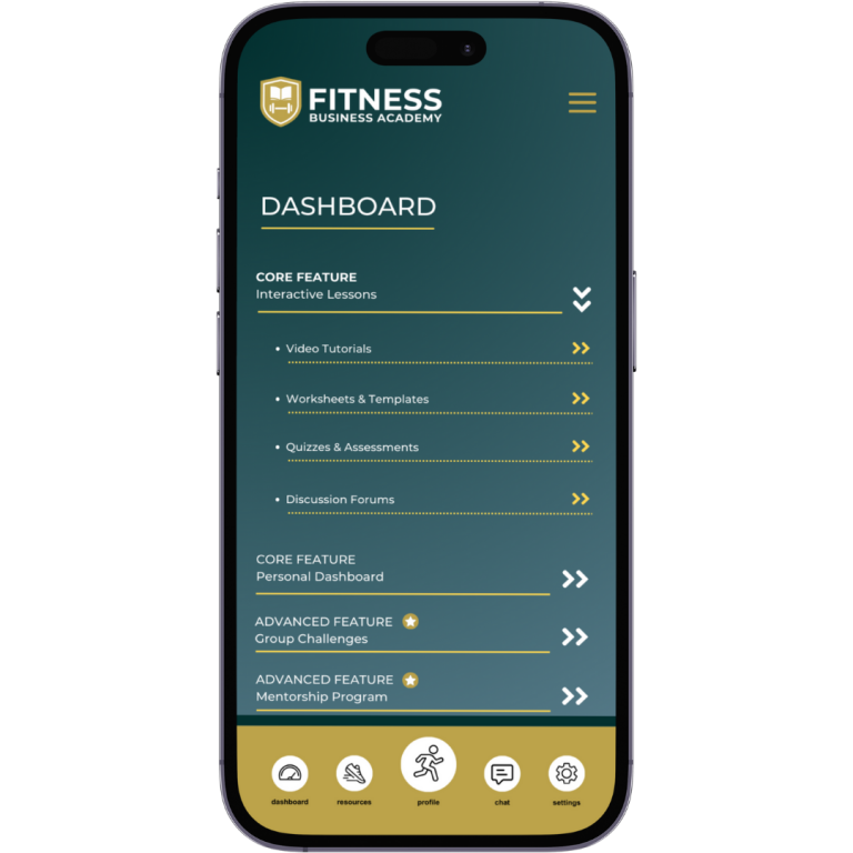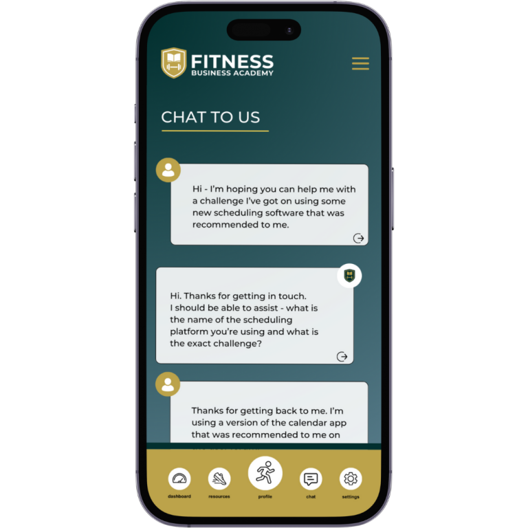 Our chat function connect users with members of the Fitness Business Academy team to answer questions related to academy coursework or any other aspect of your fitness business growth.